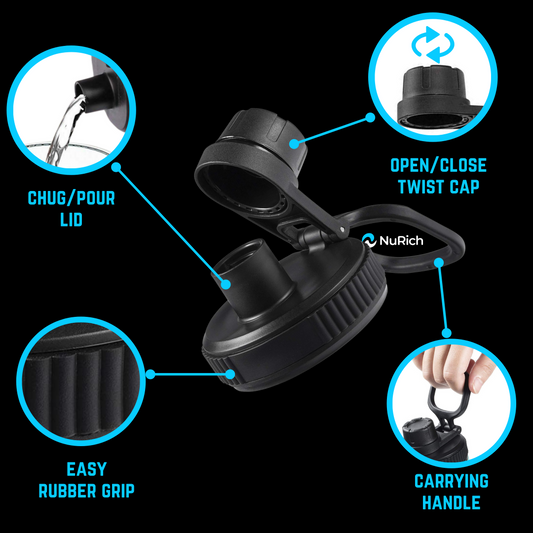 NuRich Hydro Wide Mouth Spout Twist Chug Replacement Lid or Cap Accessories Compatible with Hydroflask, Nalgene, Klean Kanteen, and Many More Top Water Bottle Brands Sizes 12 16 18 20 32 40 64 Ounce